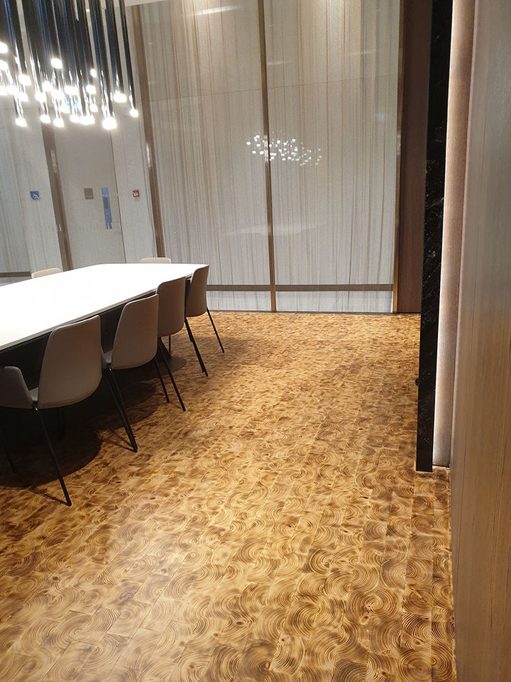 In the 90’s, we worked for Edvard Shevardnadze on his remake of the Tbilisi Bello Rossiya Theater (since destroyed by Russian tank fire!; we’ve produced flooring for the Korean National Theater, Shops in Tokyo and Orlando’s Disneylands, Singapore’s JW Marriot, lobbies in Shanghai, dance flooring in Canada and completed the worlds’ largest mesquite end grain floor in Kuwait’s Ministry of Education. We’ve provided floors in super busy restaurants like Kuala Lumpur’s Acme Restaurant, fabulous Nobu knock-offs around the country and we’ve recently completed work on the Museum of Modern Art in New York as well as that city’s La Guardia Terminal 2 luxury shopping terminal. We have end grain flooring enduring heavy commercial traffic in hotel lobbies and restaurants around the world from arid to beachfront environments.